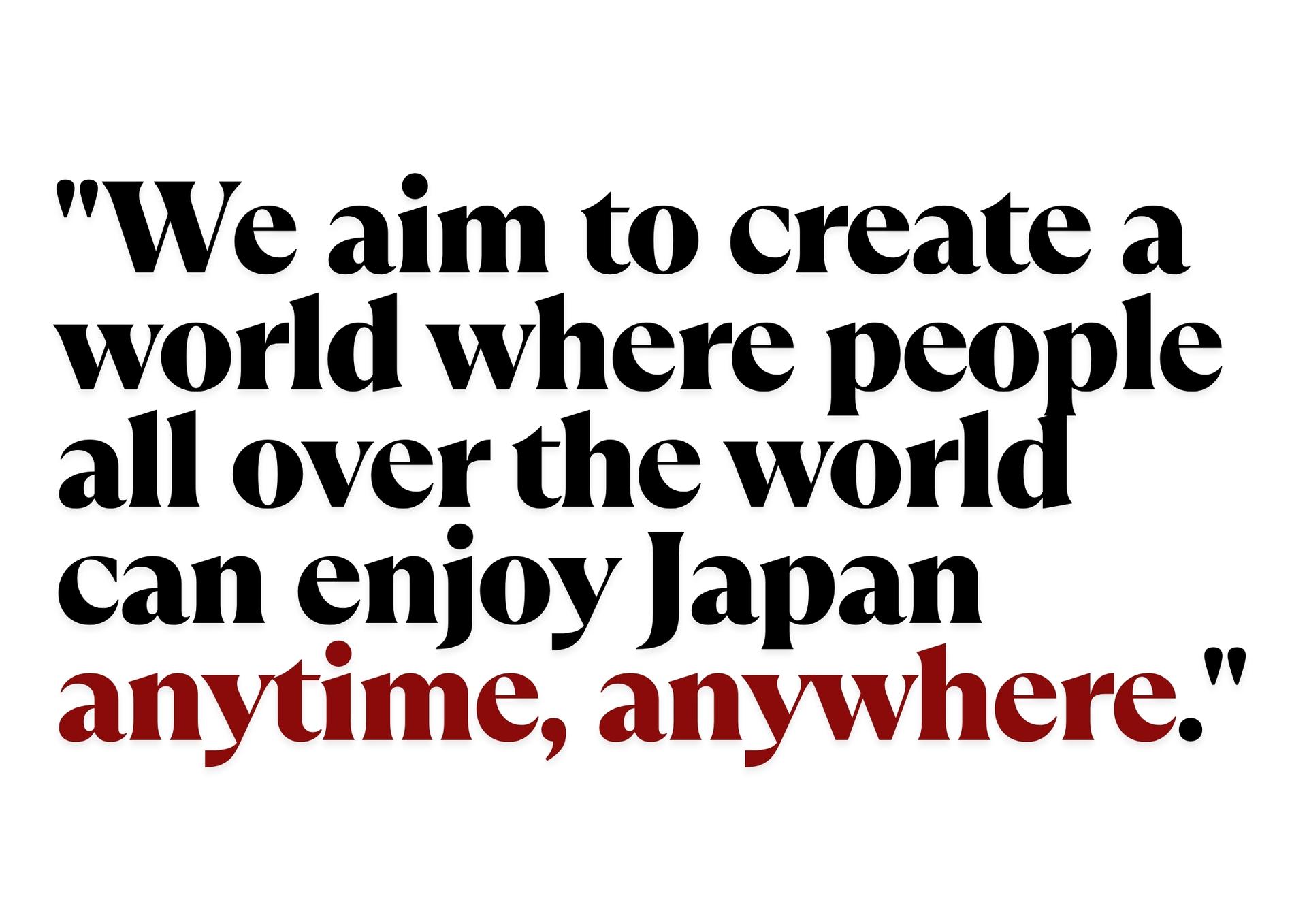 ❝I want to share Japan, its culture, and its products to the world. I want to introduce them, inspire people, and promote Japan. I want people around the world to fall in love with Japan. I want to share the amazing things from Japan with everyone globally and create a world where it's easy to enjoy Japanese products.❞